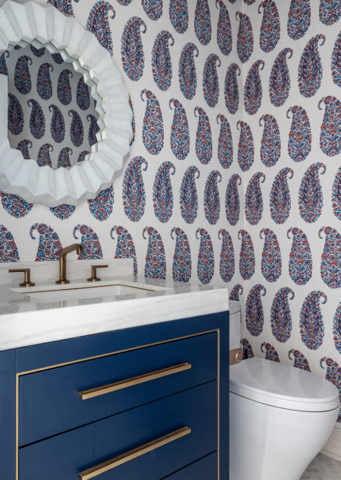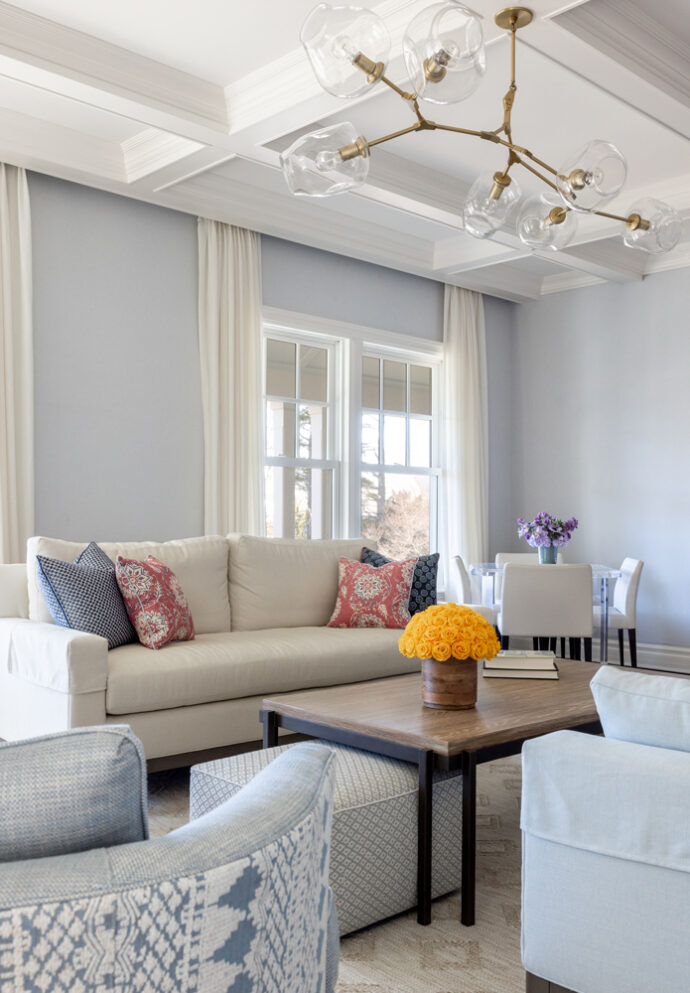 We transformed the home by layering block prints and textured fabrics inspired by the beach, incorporating dramatic and functional lighting, and ensuring the furniture proportions and flow were perfect. As lovers of cards and board games, a cozy spot by the window for rolling the dice was essential, as was a space to gather a large group around the fireplace. The owner wanted the "window sheers to blow in the breeze" literally and figuratively, and they do!