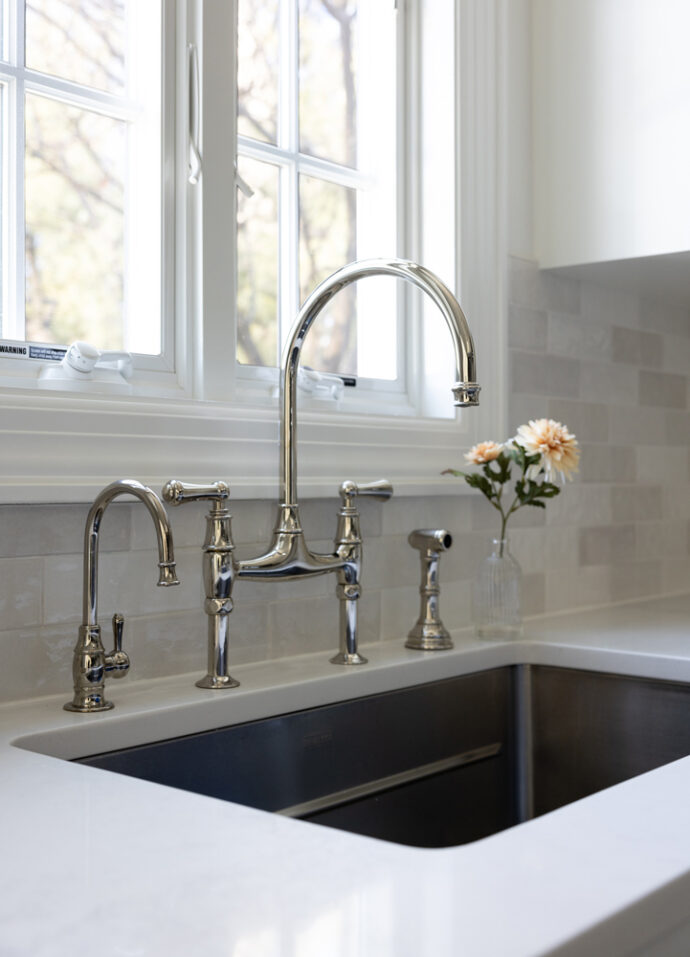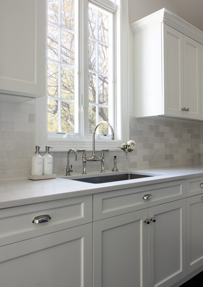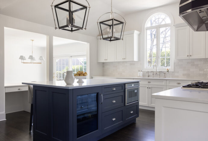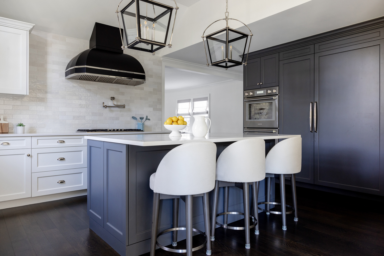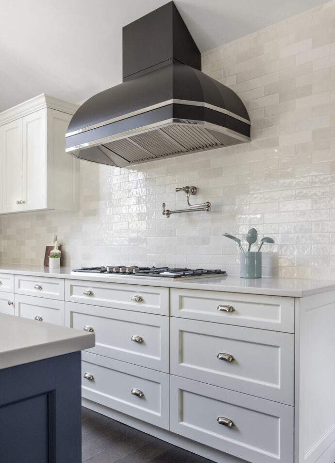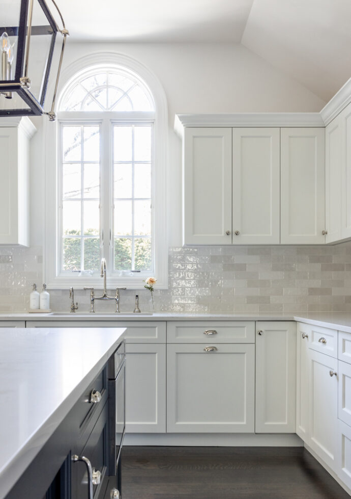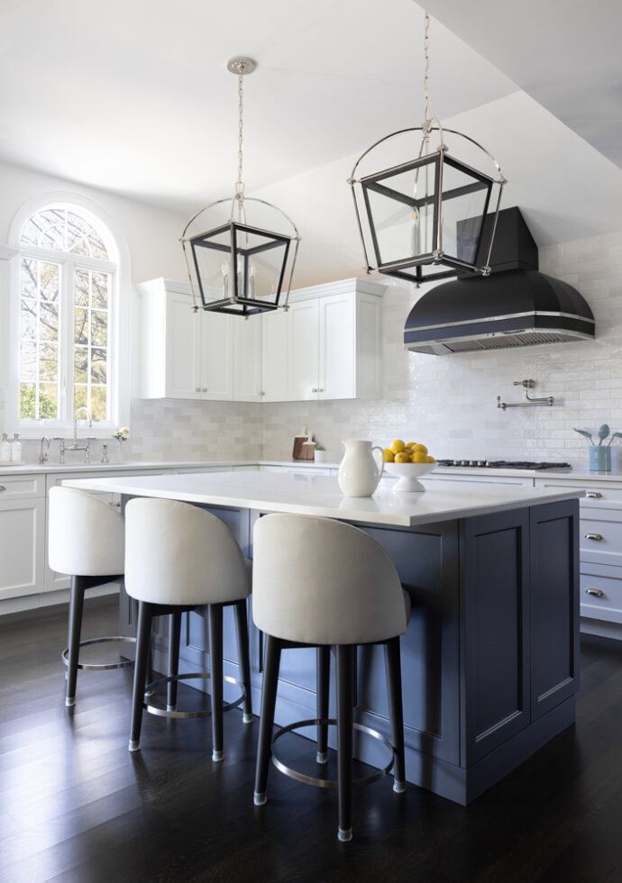 The cabinets, finished in matte charcoals and slates, along with the cream backsplash tiles, set the stage for the dramatic lighting in the cathedral ceiling over the island. By holding the materials and colors close, we created a dramatic, functional, timeless, classic kitchen for a wonderful family.