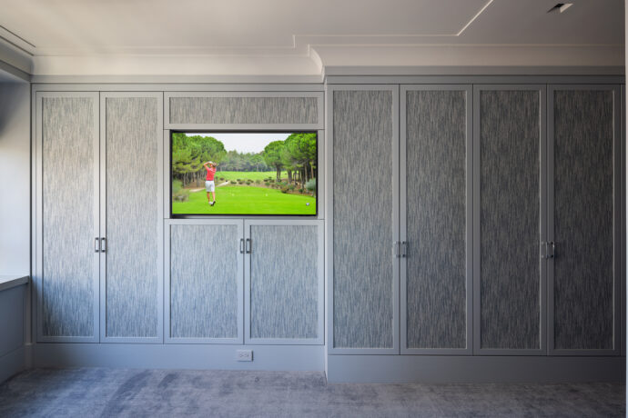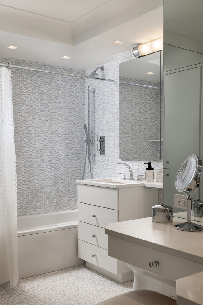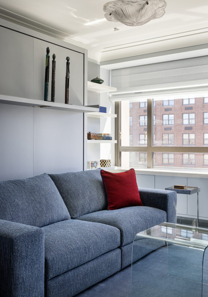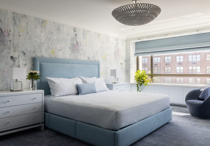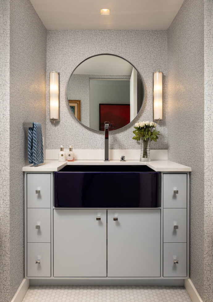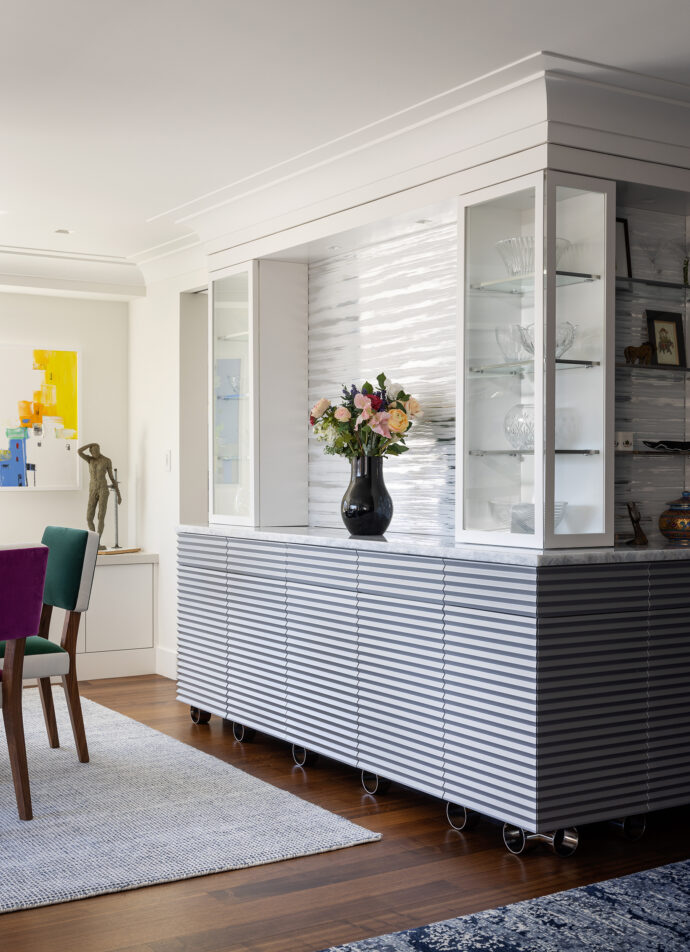 A custom wrap-around bar/server is the centerpiece of this light-filled jewel-tone residence. Soft blues and whites support the bold pops of color and help showcase art and objects from around the world. Originally four bedrooms and four full baths, AJI converted one of the bedrooms to a luxury dressing room attached to the primary suite with pocket doors and a custom sleeper sofa for the occasional full house.
