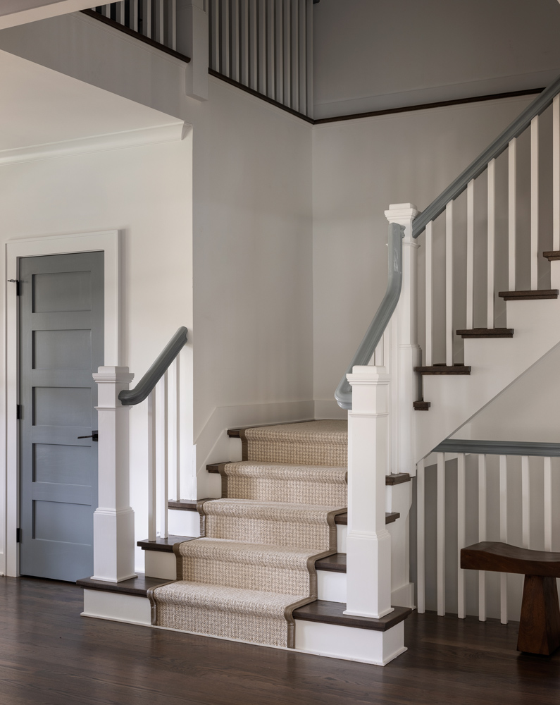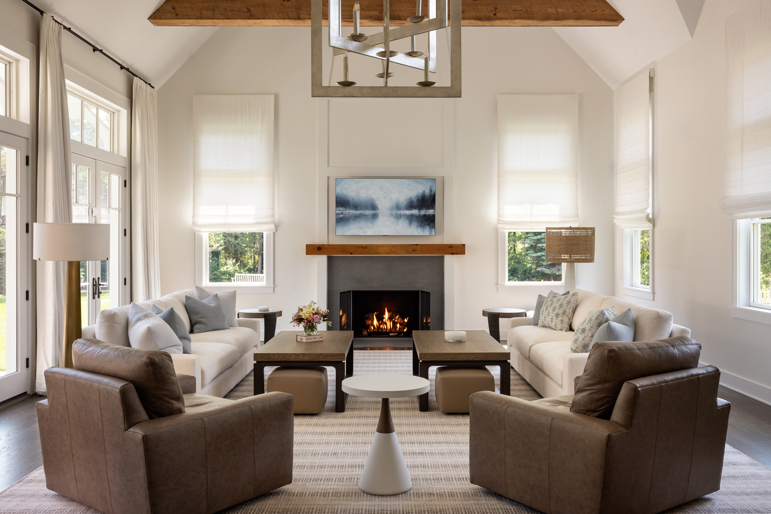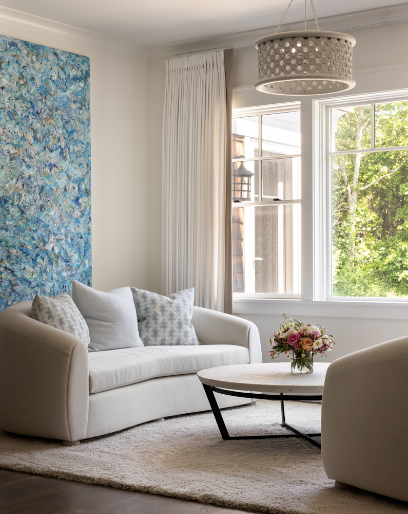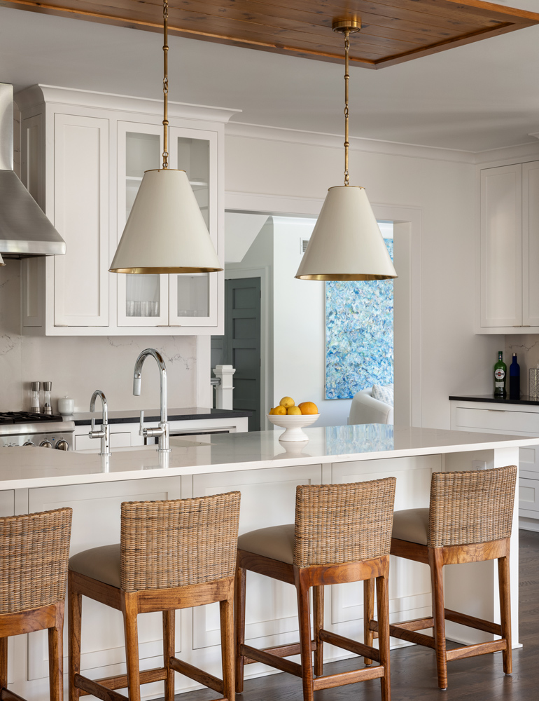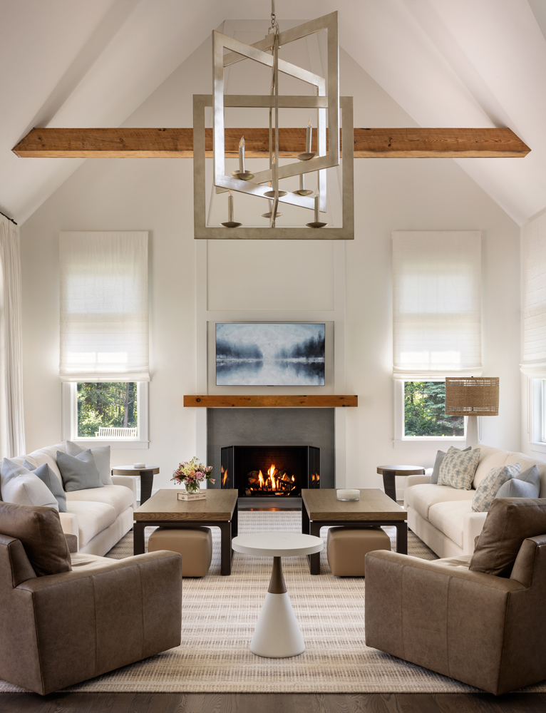 The T-shaped island was replaced with a more family-friendly kitchen island, framing the hood and centered on the fireplace. Hand-hewn beams and paneling were carefully addressed throughout, accompanied by white linen window coverings that flutter in the breeze. The handrails and doors were custom-painted a soft gray-blue. Dramatic lighting in the family room, den, dining room, and stairwell add to the beach vibe. Every room was transformed, including the guest room, which now serves as a cabana for those coming in from the pool and pickleball court.