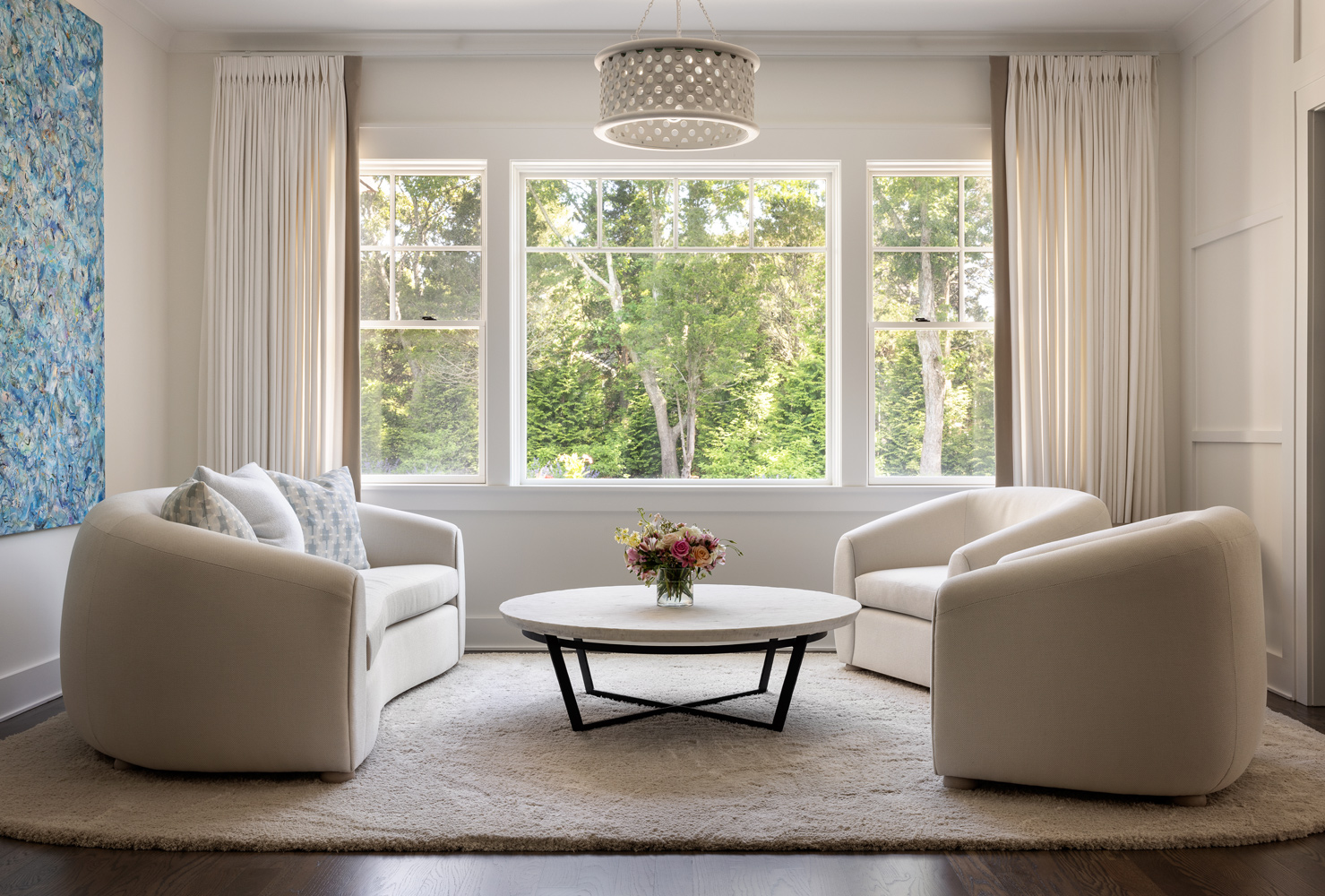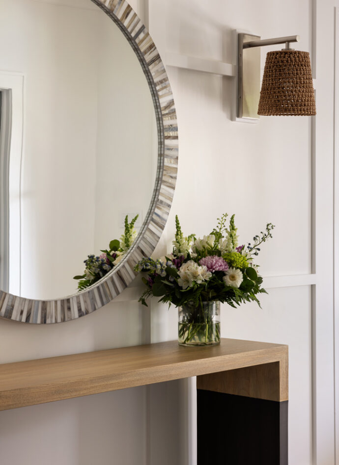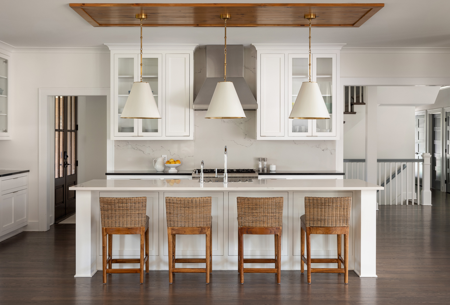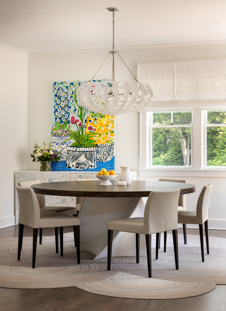 The T-shaped island was replaced with a more family-friendly kitchen island, framing the hood and centered on the fireplace. Hand-hewn beams and paneling were carefully addressed throughout, accompanied by white linen window coverings that flutter in the breeze. The handrails and doors were custom-painted a soft gray-blue. Dramatic lighting in the family room, den, dining room, and stairwell add to the beach vibe. Every room was transformed, including the guest room, which now serves as a cabana for those coming in from the pool and pickleball court.