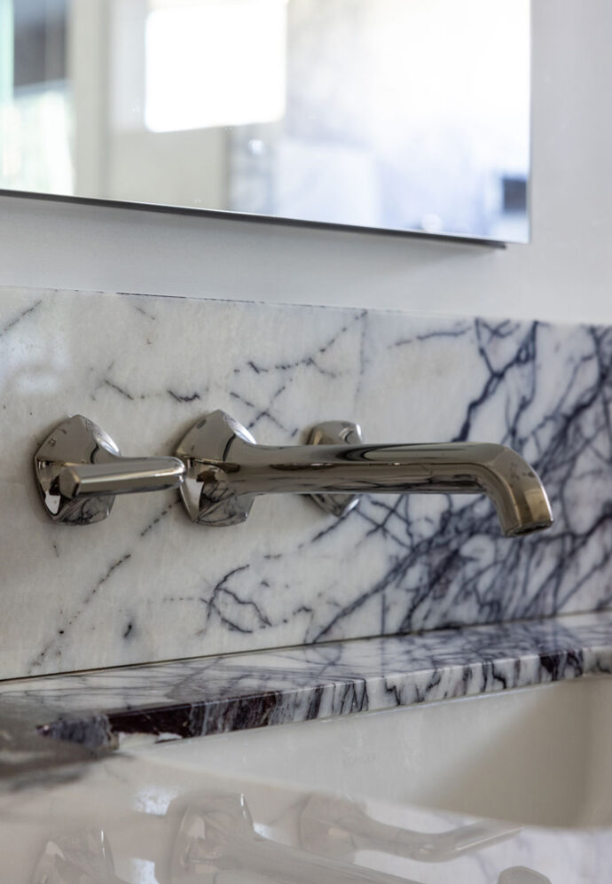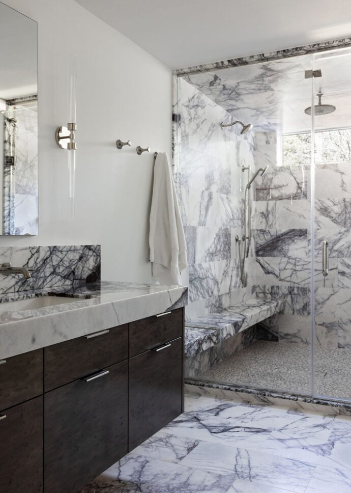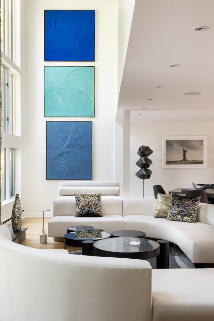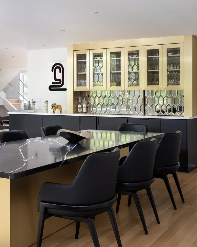 Bold design and a substantial art collection add drama and individuality to this fully renovated contemporary home. The bar backsplash runs up behind the upper cabinets and slides open at the counter to convert the server to a bar. High ceilings, beautiful light and pops of color on a neutral background add to the residence’s appeal.