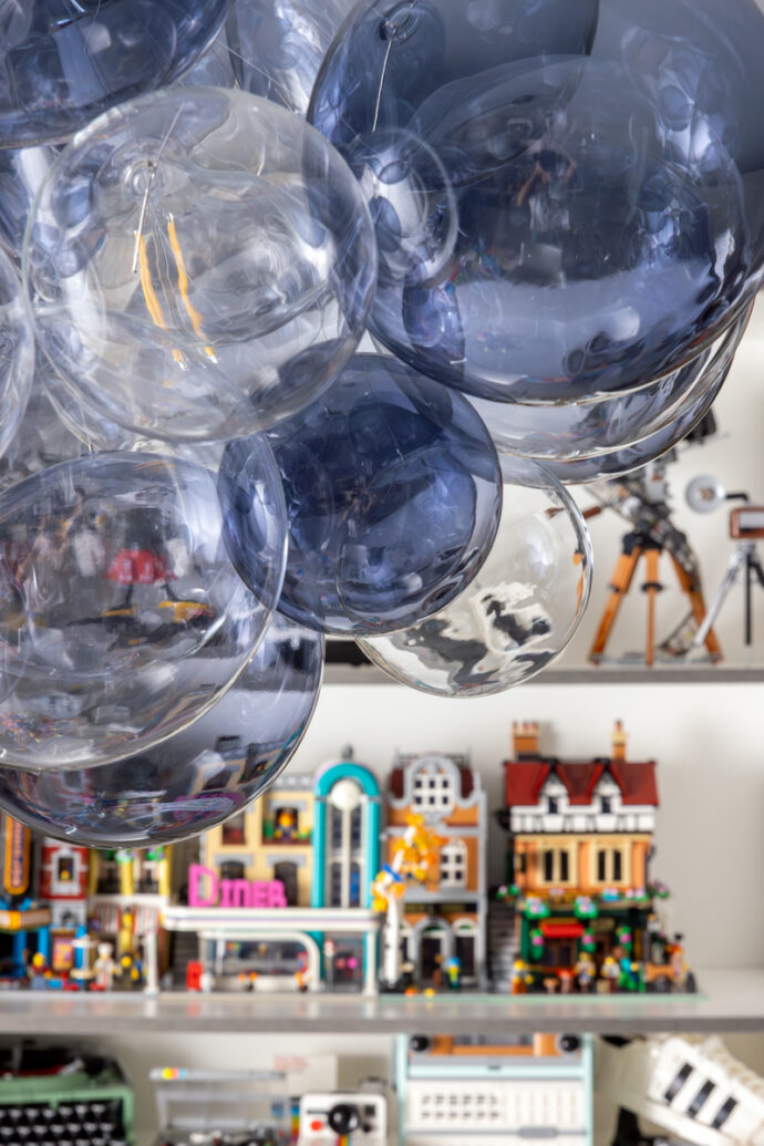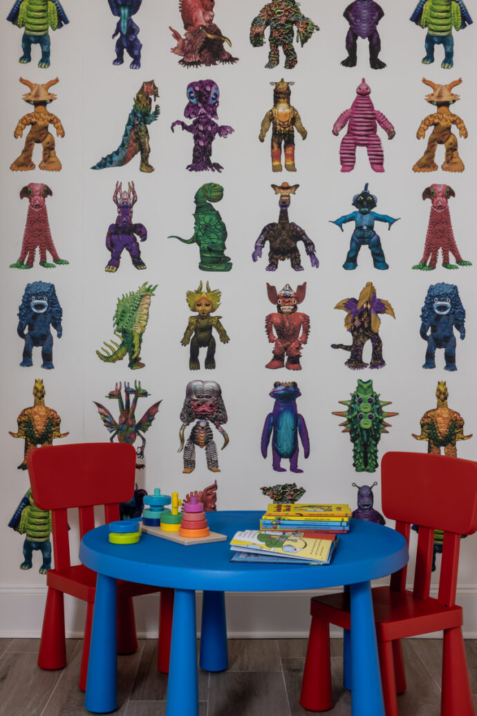 Custom built-ins anchor the main living areas, transforming Lego collections into an organized and intentional display. These moments of play are balanced with tailored furnishings, sculptural lighting, and a restrained material palette, allowing the home to feel elevated while still entirely functional. A vibrant, Lego-inspired rug introduces color and energy, grounding the space and reinforcing the home’s playful spirit.